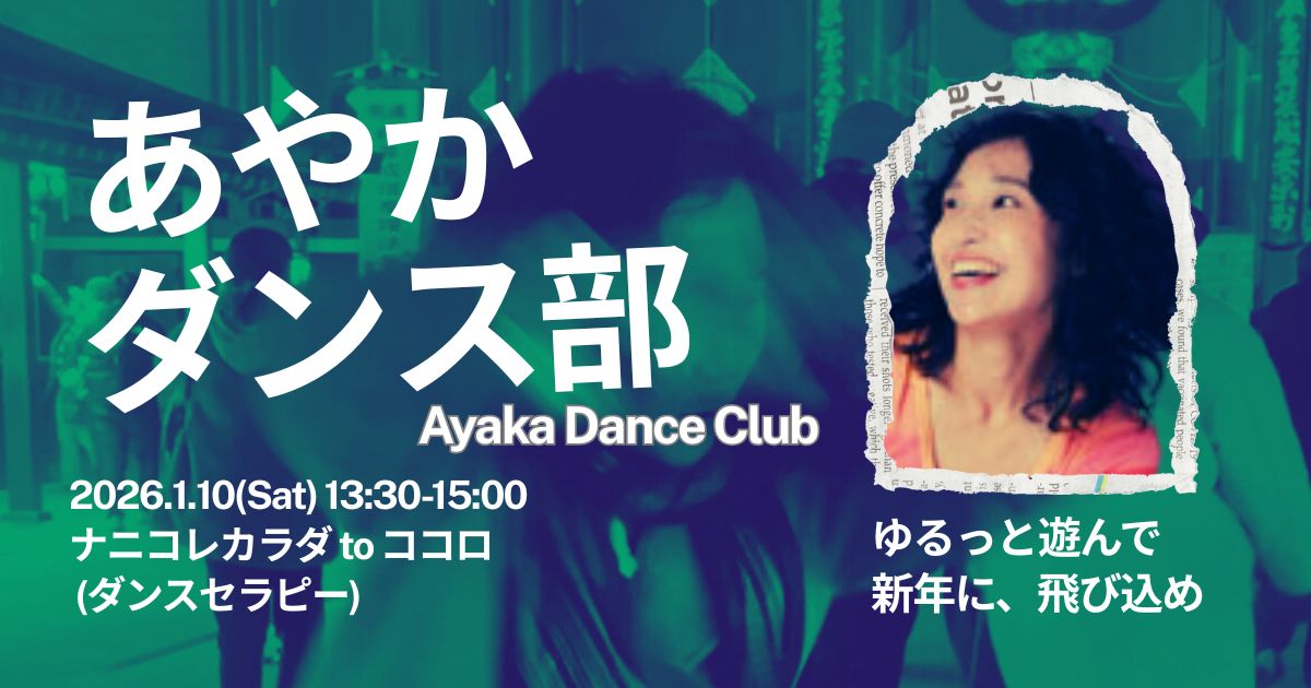 新着ブログ 「役に立った!」記念日 こんにちは! Merry Christm… Continue Reading 2025年12月25日2025年12月25日 あやか体験記 A Small Step, Bridging O… Hello everyon… Continue Reading 2025年12月23日2025年12月25日 Ayaka’s English Blog 忘れないで 皆さんこんばんは。 今まで… Continue Reading 2025年12月20日2025年12月20日 心のことば 【1/10 開催】ダンスセラピーから 始めません… 皆さんこんにちは! &nb… Continue Reading 2025年12月18日 特別クラス・イベント情報 ブログ一覧へ 新動画 Dance Journal in India! : Day5 Balancing within where I belong 購入する Dance Journal in India! : Day4 Where the rhythms grow 購入する India Report 01: アーユルヴェーダ前夜編(字幕付き) 購入する Dance Journal in India! : Day2 Arriving at Rishikesh 購入する Dance Journal in India! Day1: Dehli Nightlife 購入する 「一畳ダンサー」に寄せる想い 購入する あやかと1畳ダンサー! 第1回 ¥1,100 購入する チェアヨガ: ツイストすっきり編 ¥1,100 購入する ダンスの生まれる場所 購入する あやか英語のミニ歴史・子供時代編 購入する 【踊りが絵になる】 購入する Ayaka’s room vol.1 (あやかエイゴでつぶやくvol.1) 購入する 動画カテゴリー 無料動画 ダンス (1) あやかの部屋 (6) パフォーマンス動画 (5) 会員動画 ヨガ (1)