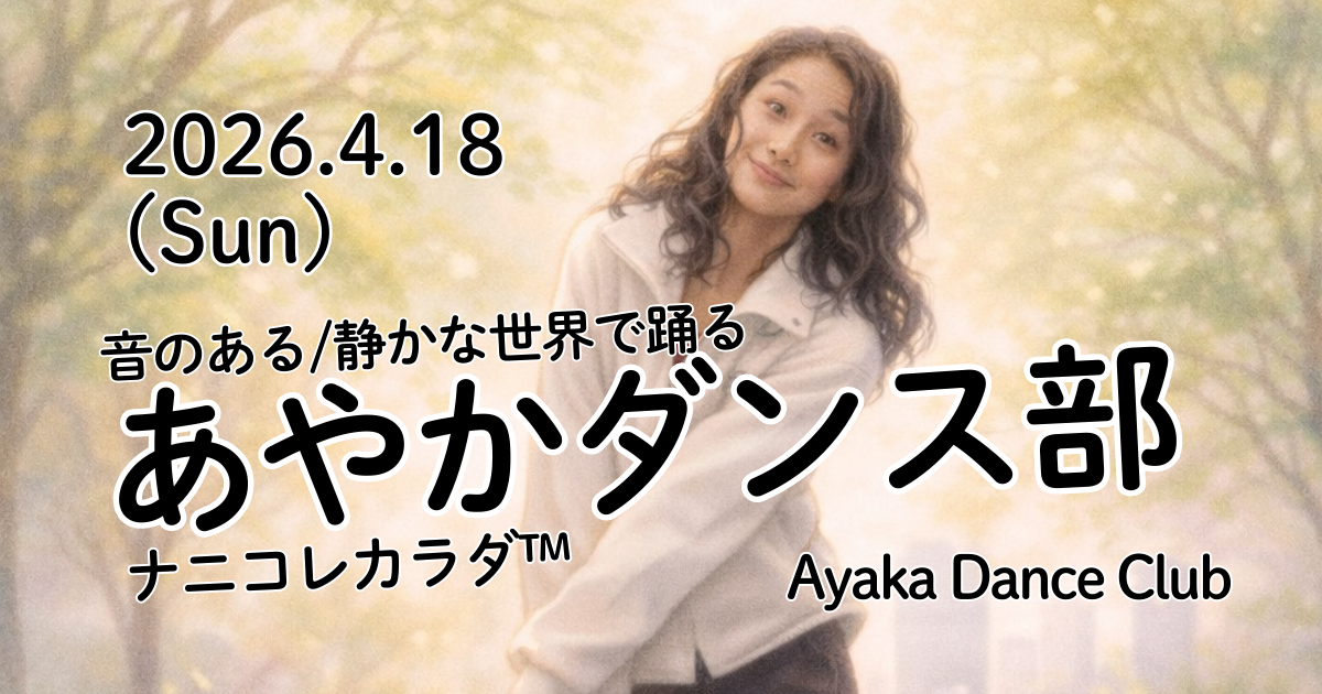 新着ブログ 【4/18 開催】あやかダンス部(手話通訳あり) 「私って、意外と自由に動け… Continue Reading 2026年3月18日 特別クラス・イベント情報 【3/23 開催】あやかとダンスで世界旅行! 春休みの思い出作り、準備は… Continue Reading 2026年3月16日 特別クラス・イベント情報 イマーシブに行動する夜 こんにちは! … Continue Reading 2026年3月8日 あやか国内手話留学 生きる、って。 皆さんこんにちは。 あっと… Continue Reading 2026年3月2日2026年3月3日 未分類 ブログ一覧へ 新動画 【ナニコレ02】「3D呼吸」解説 ★字幕付き 購入する 【ナニコレ01】「巡る呼吸」解説 (★字幕付き) ¥3,500 購入する Dance Journal in India! : Day5 Balancing within where I belong 購入する Dance Journal in India! : Day4 Where the rhythms grow 購入する India Report 01: アーユルヴェーダ前夜編(字幕付き) 購入する Dance Journal in India! : Day2 Arriving at Rishikesh 購入する Dance Journal in India! Day1: Dehli Nightlife 購入する 「一畳ダンサー」に寄せる想い 購入する あやかと1畳ダンサー! 第1回 ¥1,100 購入する チェアヨガ: ツイストすっきり編 ¥1,100 購入する ダンスの生まれる場所 購入する あやか英語のミニ歴史・子供時代編 購入する 動画カテゴリー 無料動画 ダンス (1) あやかの部屋 (6) パフォーマンス動画 (5) 会員動画 ヨガ (1) 特別動画 ナニコレカラダ™ (2)